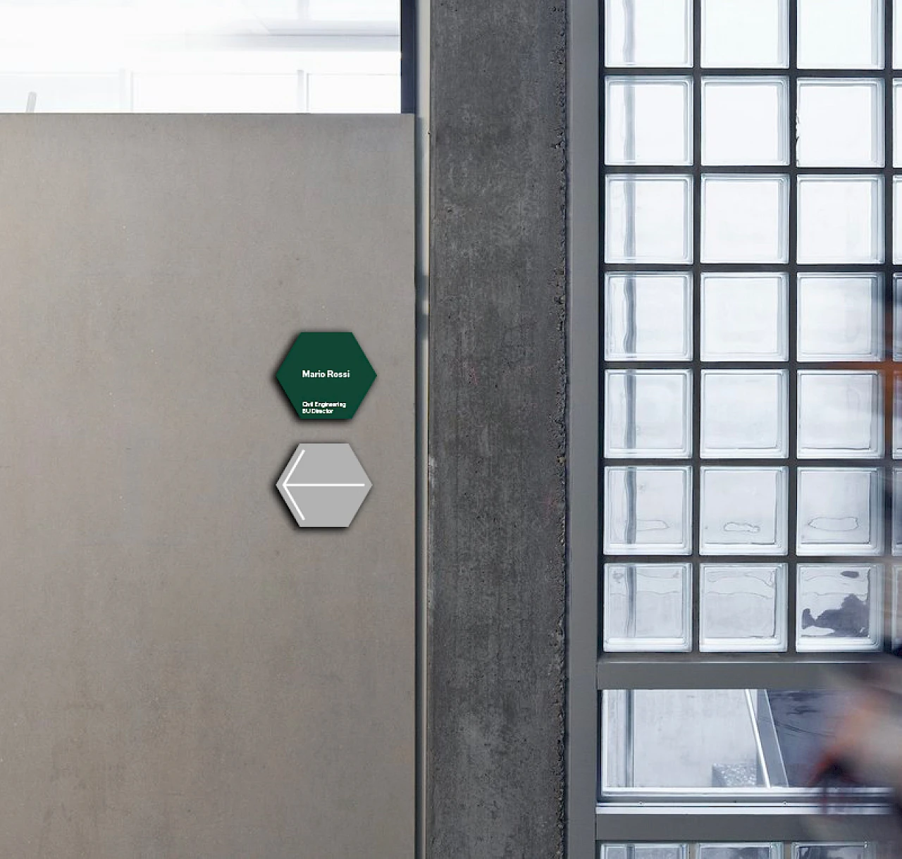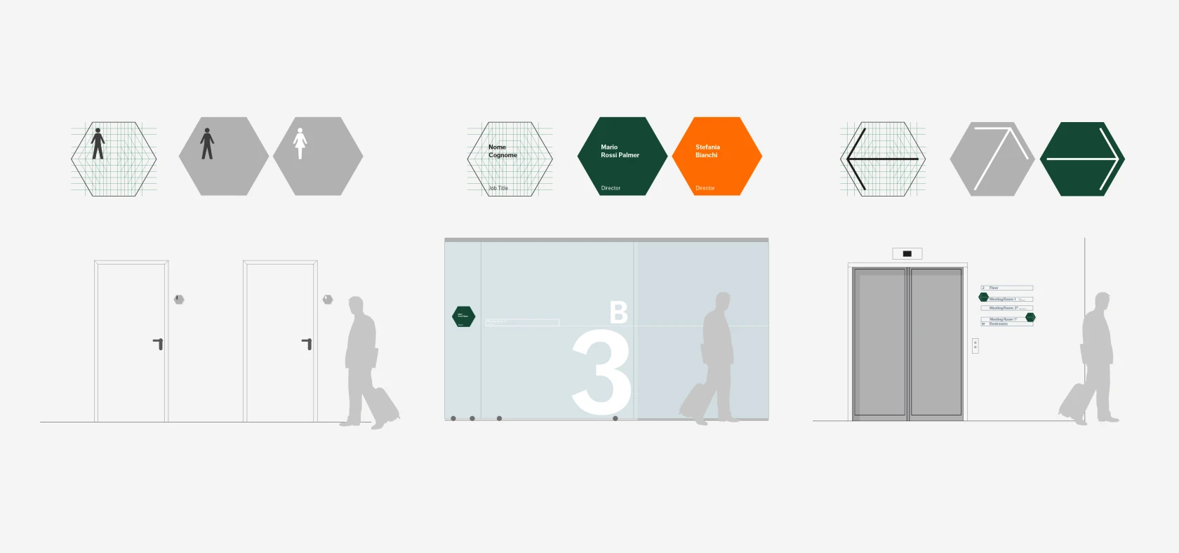 The shape of the hexagon is also used in the signage, with a modular and versatile structure.