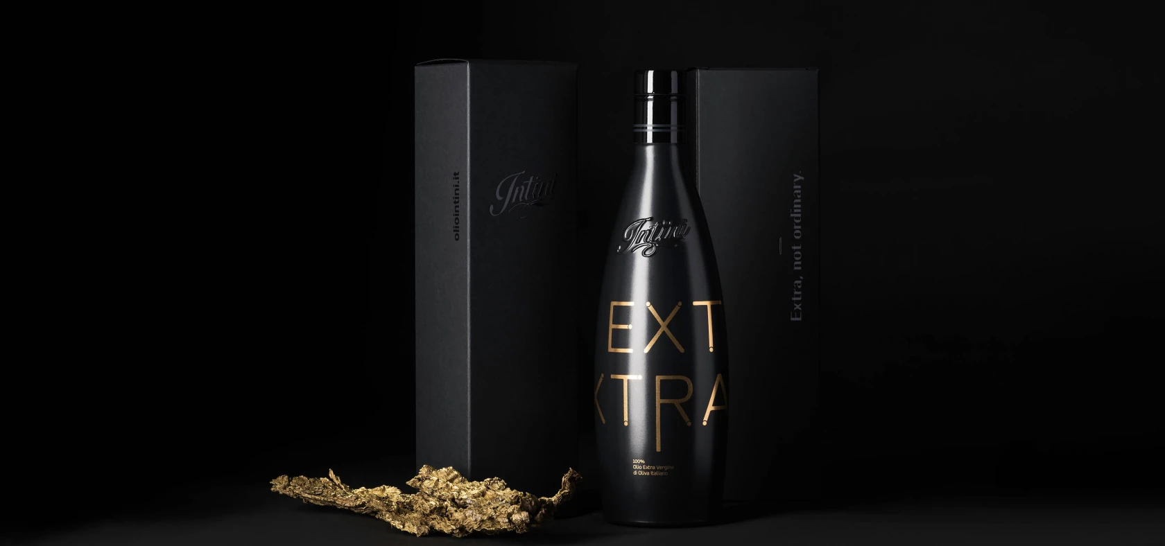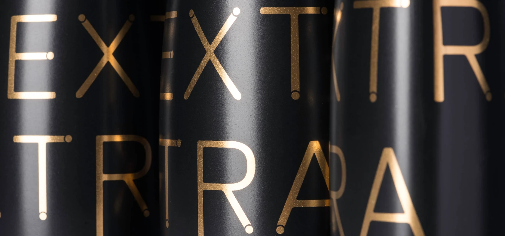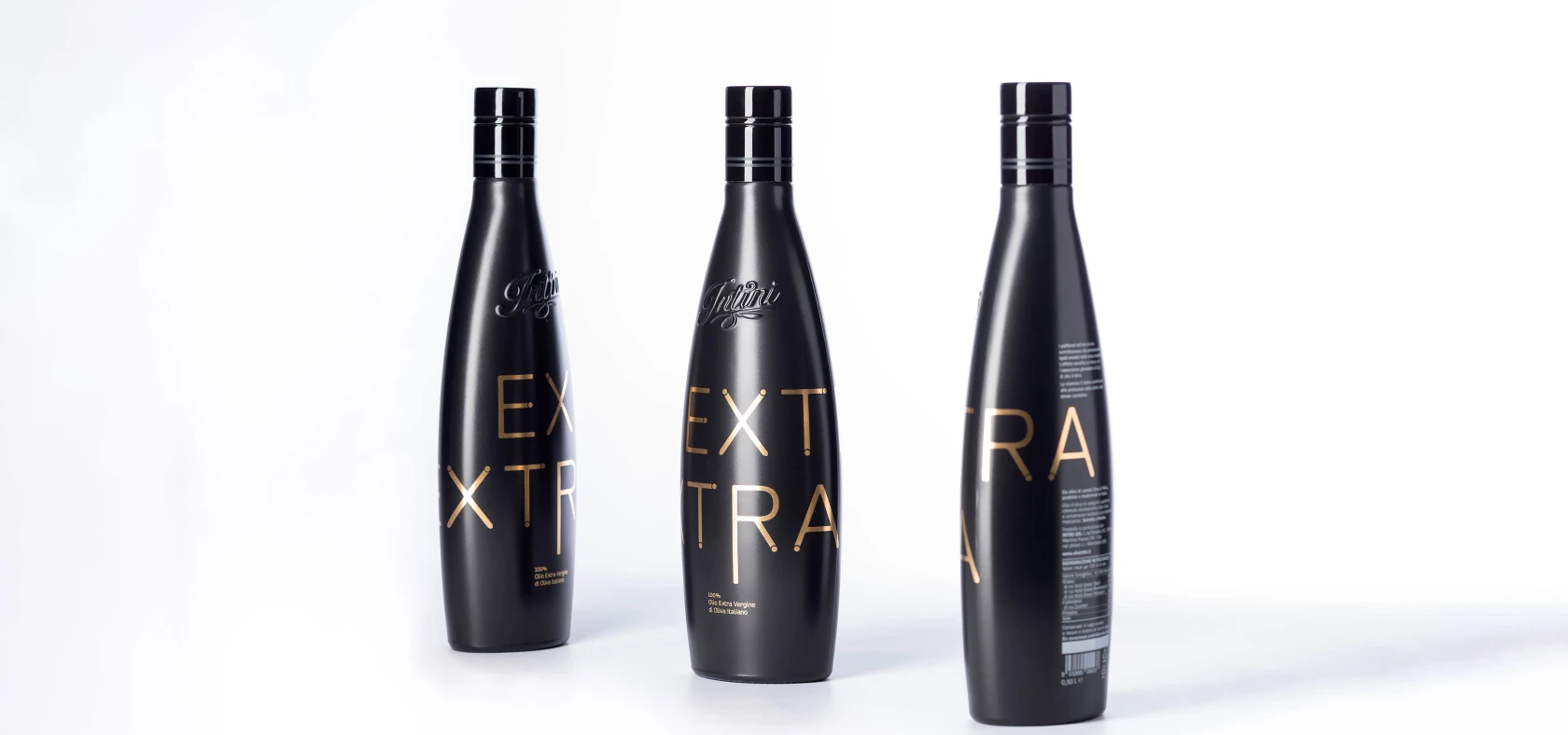 Less The bottle is custom-made, screen printed in pure gold through to a cutting-edge eco-friendly printing process. The linear font visually recalls the action of the oil extraction and culminates in a stylized representation of the polyphenols, which EXTRA contains in large quantity.