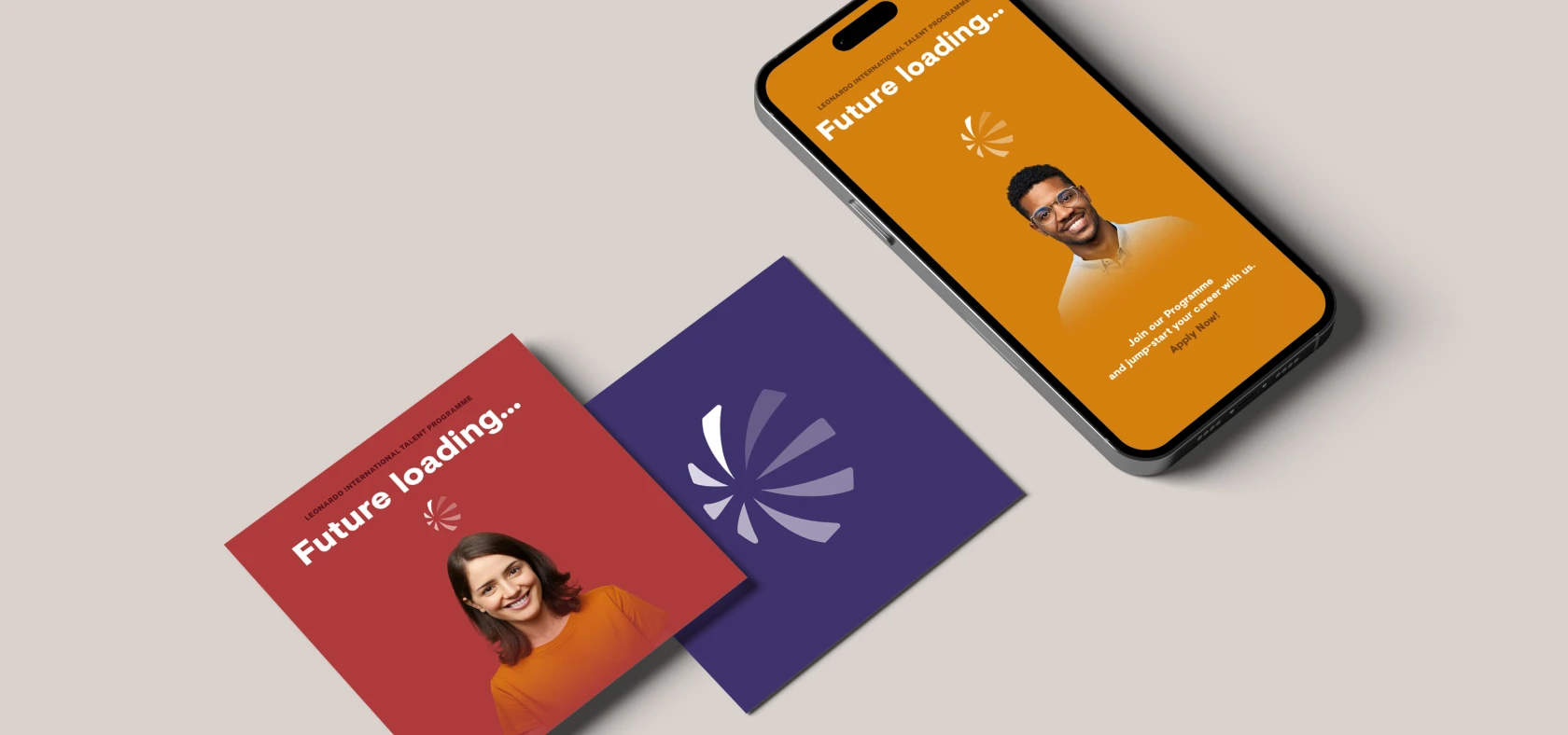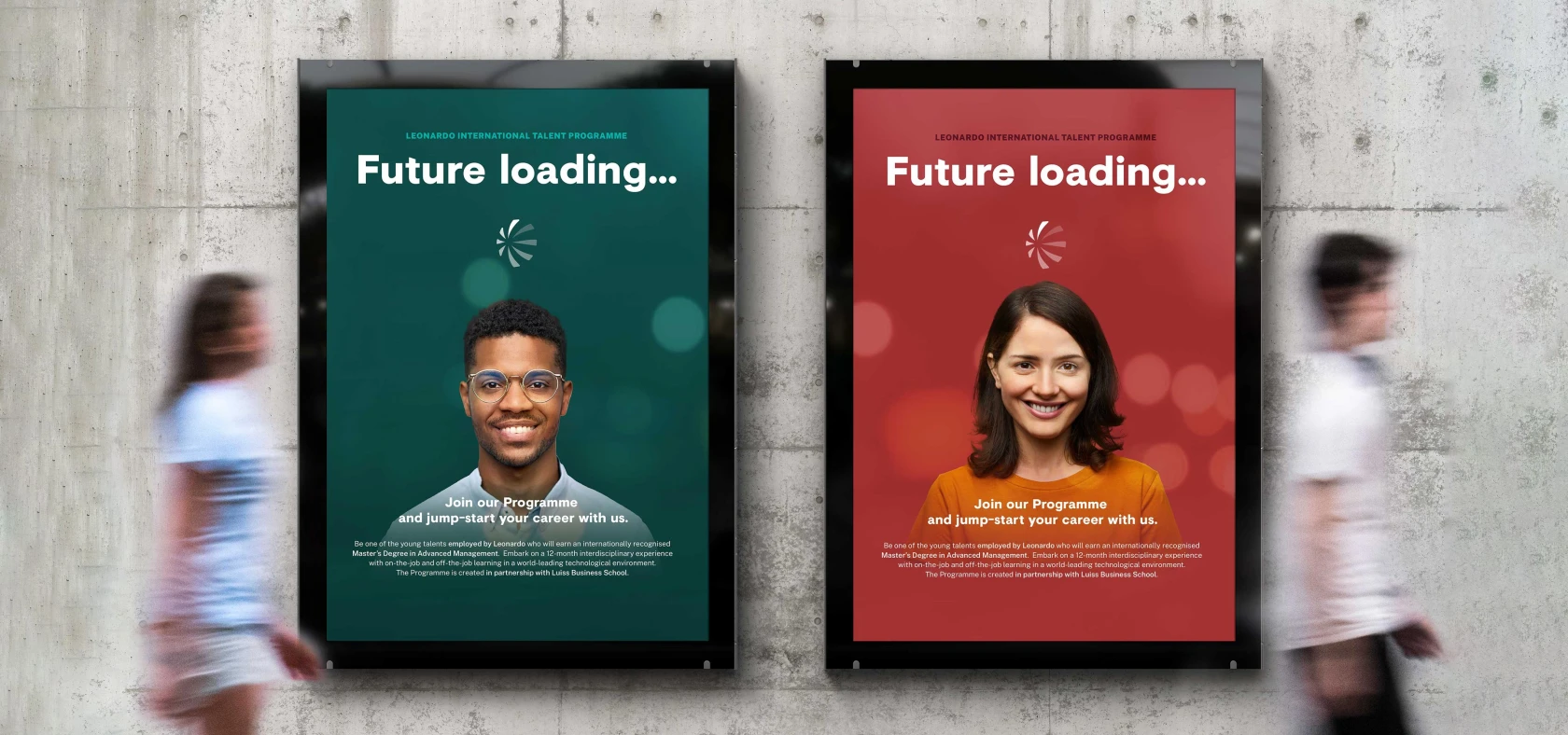 Less Leonardo's logo is the focus. We see it as an element that is “loading”, symbolizing the training journey that gradually enriches through experiences and projects.